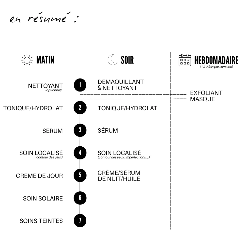 Aller du plus léger au plus riche, et terminer avec la protection solaire le matin. Cette logique est confirmée par de nombreux dermatologues et experts en soins cutanés.