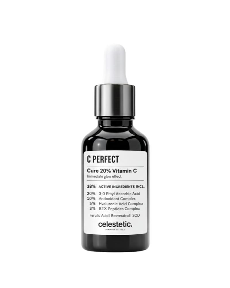 Le C Perfect contient du 3-O Éthyl Ascorbic Acid, un dérivé de vitamine C plus stable, mieux toléré et hautement biodisponible. Cette forme de vitamine C combine donc haute stabilité, excellente pénétration cutanée et grande tolérance. Contrairement à la vitamine C pure, elle ne s’oxyde pas facilement et agit en profondeur pour éclaircir le teint, stimuler le collagène et réduire les taches, sans irriter la peau.