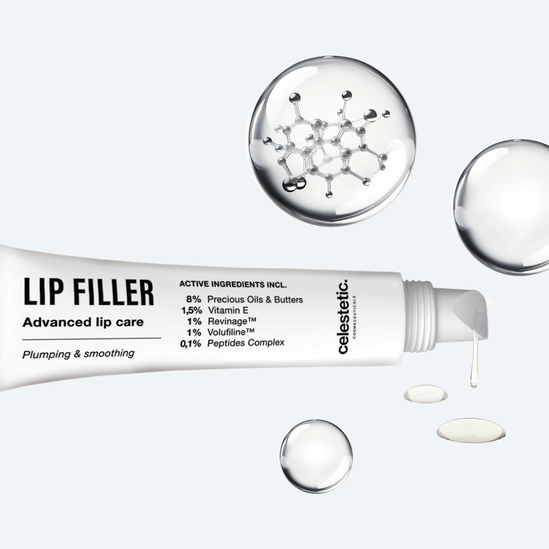 De combinatie van ingrediënten zoals Volufiline™, Revinage™ en hydraterende stoffen zorgt voor een complete en gebalanceerde benadering van lipverzorging.