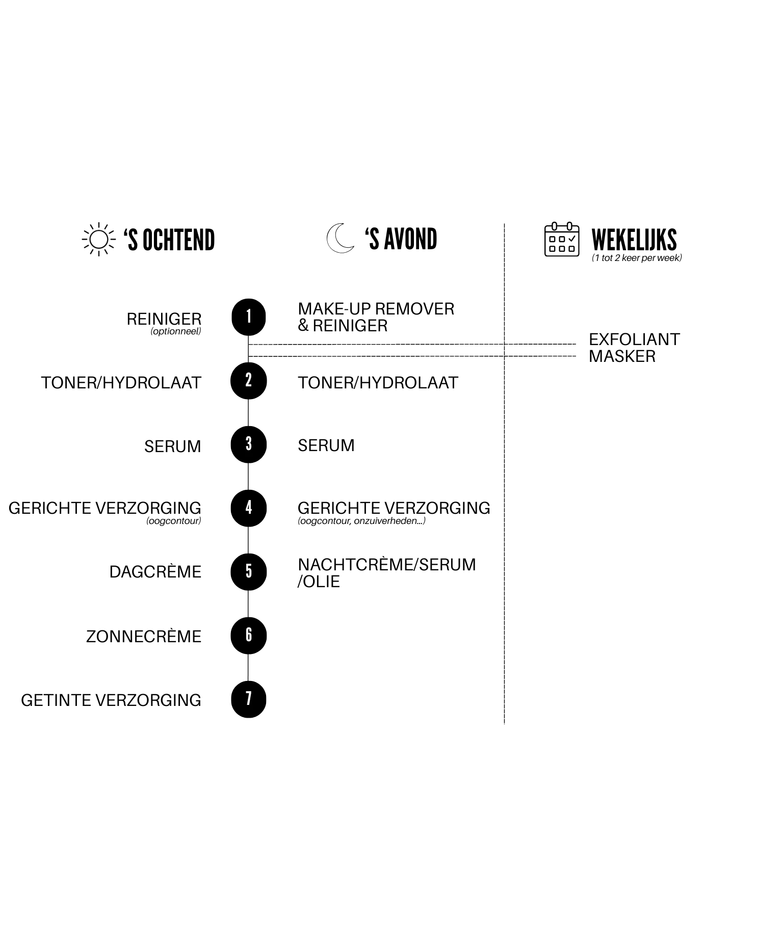 - Avond: eerst make-up verwijderen, daarna reinigen om make-up, vervuiling en zonnefilters weg te nemen.